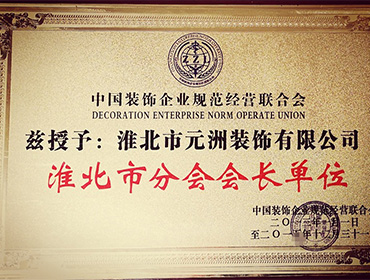 中國(guó)裝飾企業(yè)規(guī)范經(jīng)營(yíng)聯(lián)合會(huì)茲授予“淮北市分會(huì)會(huì)長(zhǎng)單位”